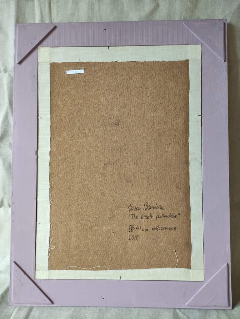 OUTER FRAME: The outer wooden frame shown in the pictures is available and can be supplied together with the artwork at the customer’s request for an additional agreed upon fee.